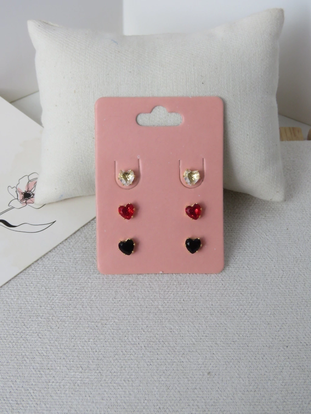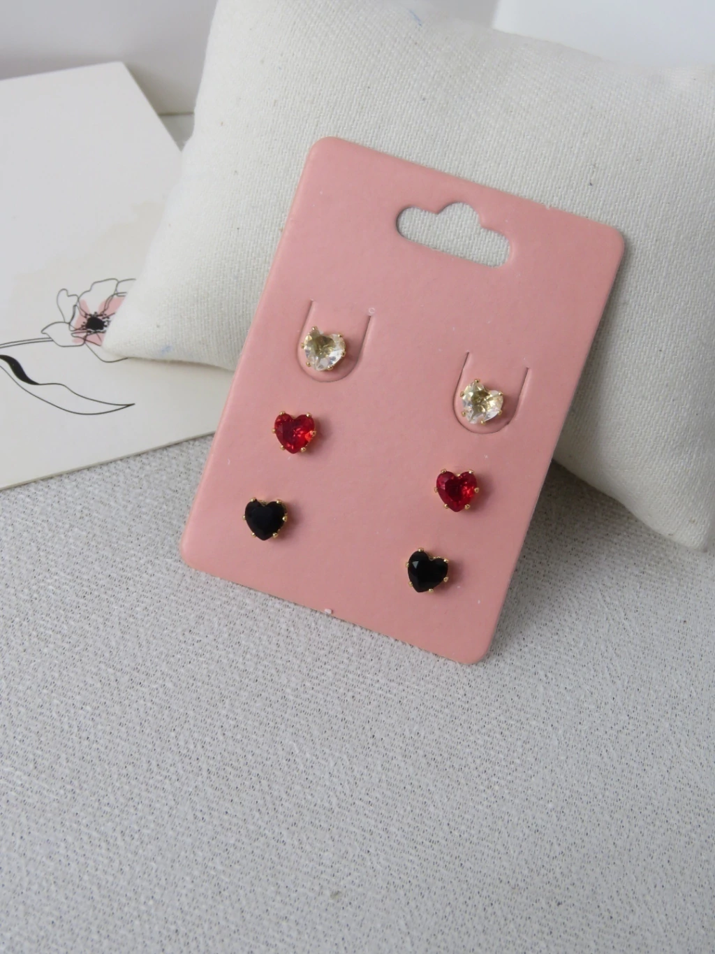 BRINCO CARTELA FOLHEADO A OURO - TRIO CORAÇÃO ZIRCONIA CRISTAL/VERMELHO/PRETO
