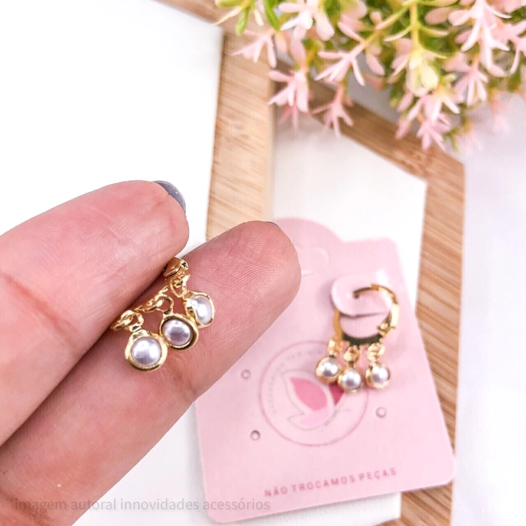 BRINCO FOLHEADO A OURO ARGOLINHA 3 PEROLAS