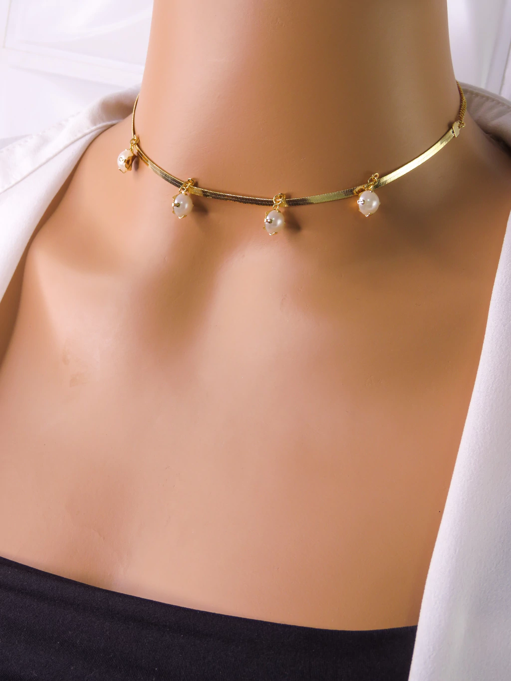 COLAR JOINHA FOLHEADA A OURO - FITA COM APLICAÇÕES EM PEROLA