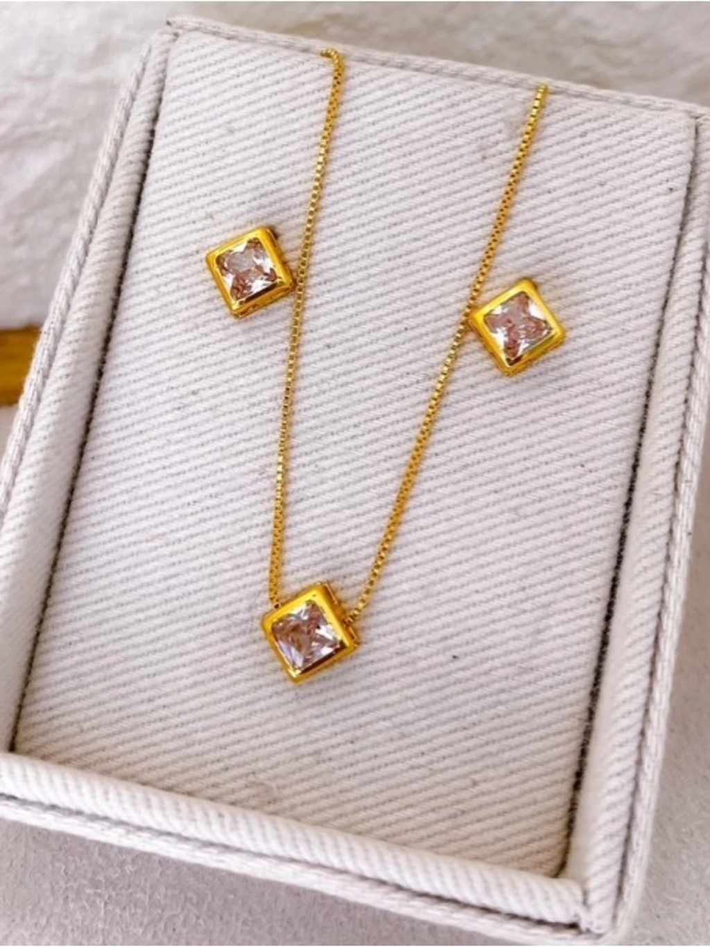 CONJUNTO FOLHEADO A OURO - QUADRADO ZIRCONIA REDONDO