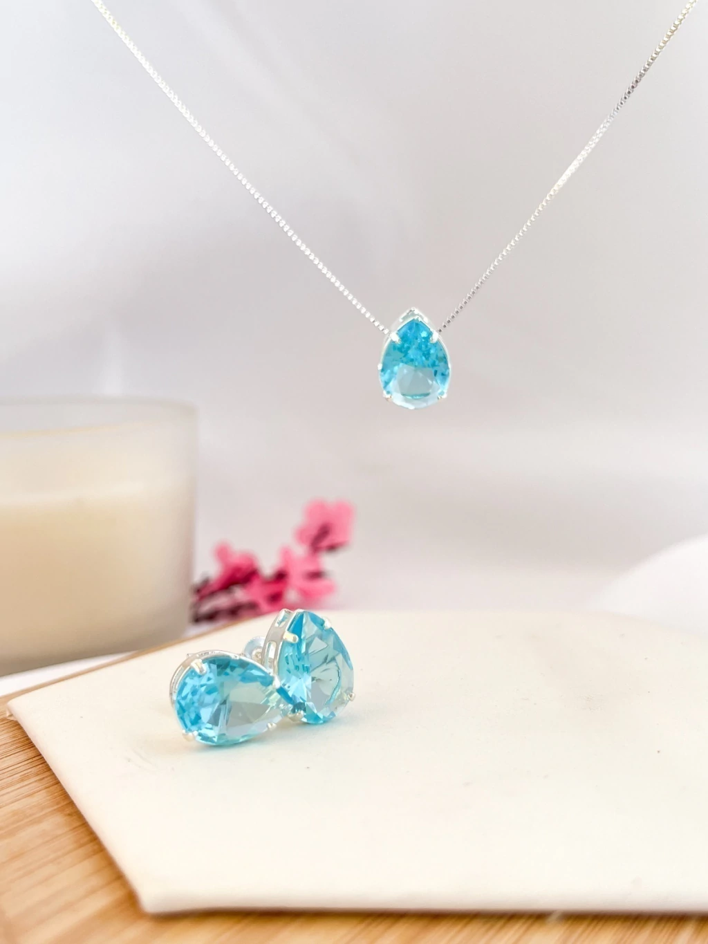 CONJUNTO FOLHEADO A PRATA - PINGENTE GOTA ZIRCONIA AZUL CLARO