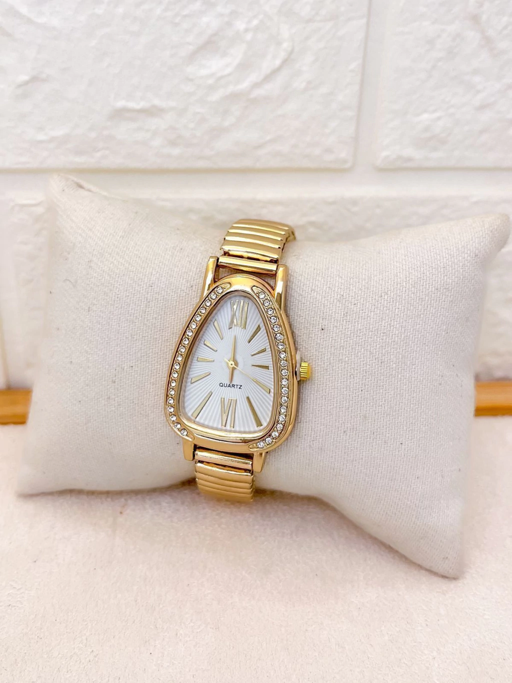 RELÓRIO FEMININO ANALÓGICO PULSEIRA ELASTICA - CABEÇA DE COBRA CRAVEJADO DOURADO FUNCO BRANCO